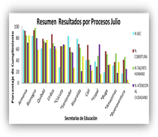 El Componente de Procesos, del Proyecto de Modernizaci贸n presenta el ranking de Secretarias, correspondientes al mes de Julio,consolidado obtenido como resultado del diagnostico a los procesos de cobertura, talento humano, atenci贸n al ciudadano,y calidad educativa, contemplado dentro de las Secretarias de Educaci贸n que fueron visitadas durante el mes, y que adelantan el proceso de Certificaci贸n.