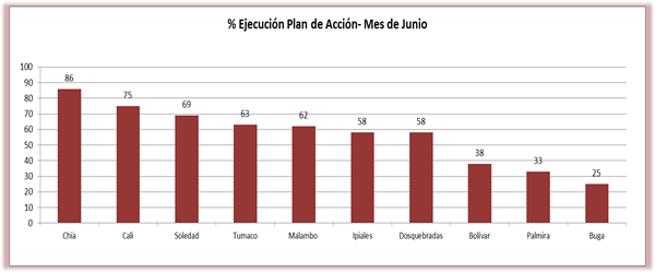 En el mes de Junio se realizaron diez acompañamientos al Plan de Acción en las SecretarÃas de Educación de ChÃa, Cali, Soledad, Tumaco, Malambo, Ipiales, Dosquebradas, BolÃvar, Palmira y Buga.