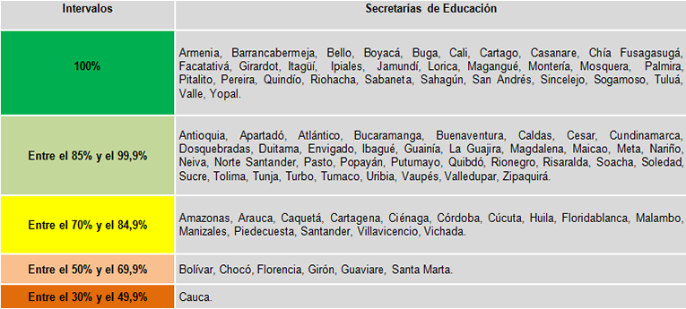 17 secretarÃas se encuentran en nivel medio - alto, es decir; en el rango entre 70% y 84,99%, a este nivel escalaron las secretarÃas de Huila, Caquetá y Vichada.