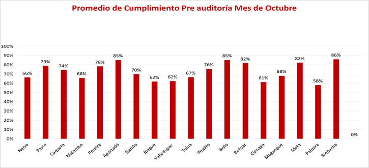 En el mes de Octubre se realizaron 18 Pre-auditorÃas a las SecretarÃas de Educación de Neiva, Pasto, Caquetá, Malambo, Pereira, Apartadó, Nariño Ibagué, Valledupar Tuluá, Pitalito, Bello, BolÃvar, Ciénaga, Magangué, Meta, Palmira y Riohacha, siendo la SecretarÃa de Educación Municipal de Riohacha con un 86% la de mejor promedio de cumplimiento en los Macro procesos certificados de Cobertura, Calidad Educativa, Atención al Ciudadano y Talento Humano.